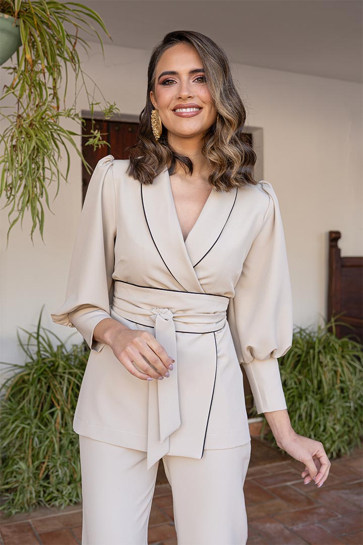 Conjunto de dos piezas, biolastico, pantalón de corte recto y ajustado a la cintura de tiro alto. Blazer de manga francesa perfecta para cualquier evento.